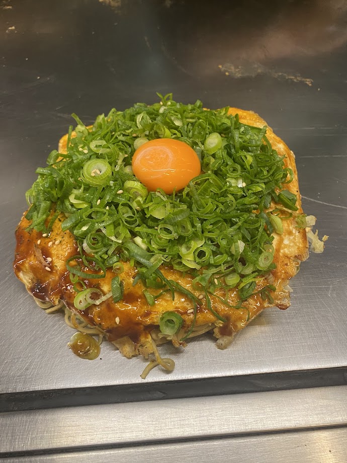 生地を作る、混ぜる 、広げる ➡ キャベツ、玉ネギを広げコショーを振る ➡ 揚げ玉、イカ天、エビ、豚肉 、揚げ焼いた蕎麦 を乗せる ➡ タマゴ生地を広げる ➡ 生地をON ➡ ネギを大量に振る ➡ 月見をON ➡ 広島名物オタフクソースをたっぷり ➡ ゴマと青のりをON