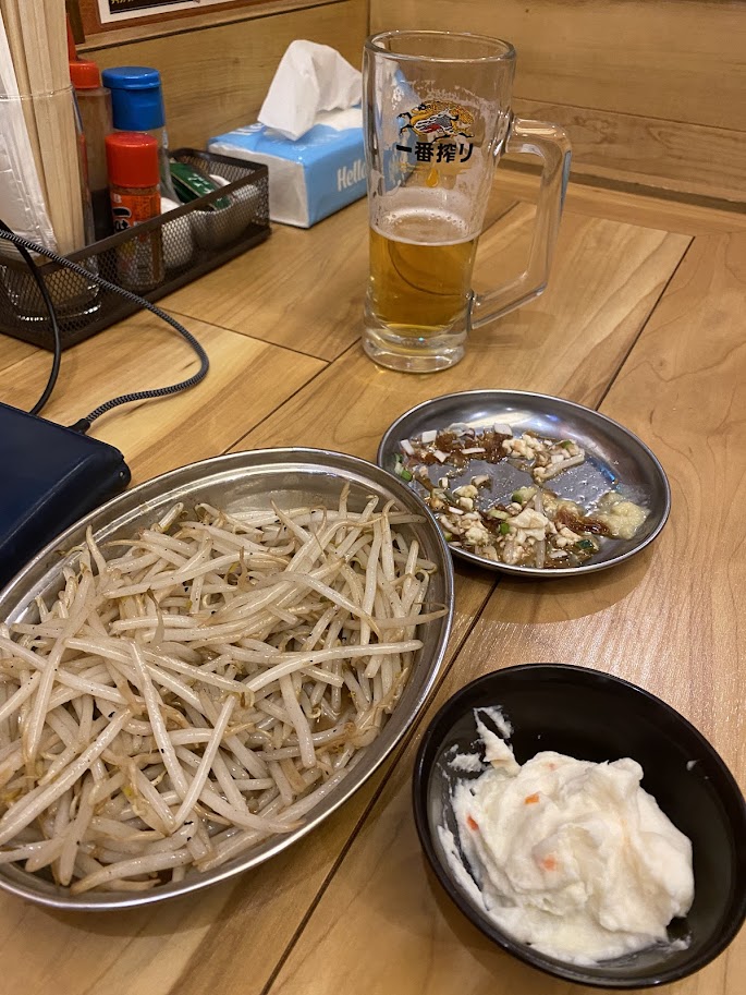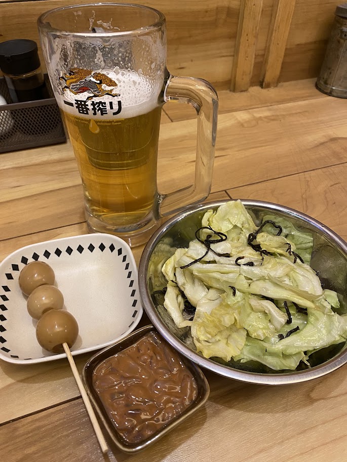 生ビール2杯、いかの塩辛、うずくん串、塩こんぶキャベツを注文。