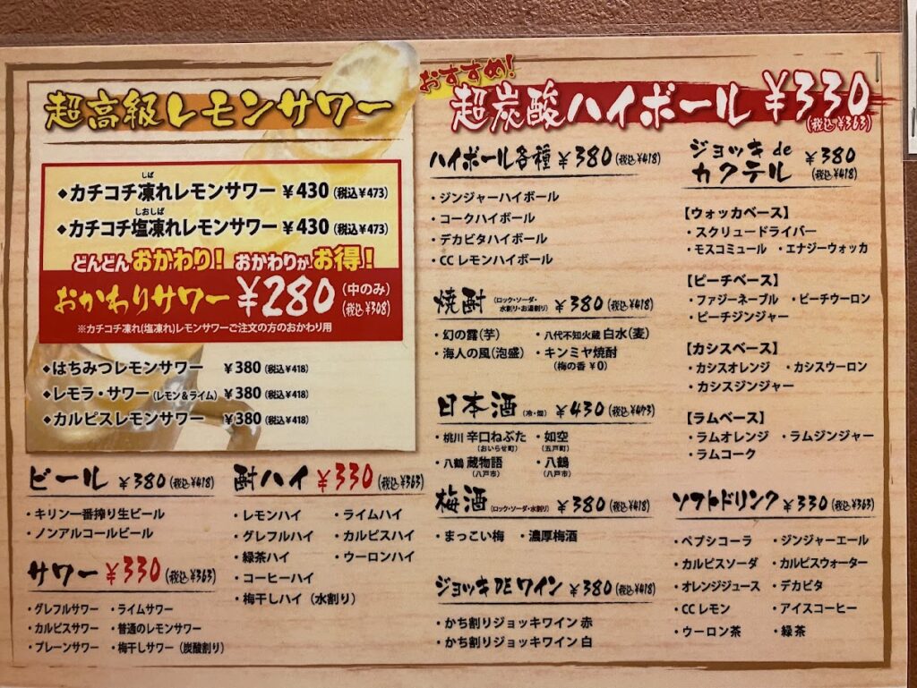 メニューを見ると、センベロ以外でもかなり安いのがわかる。