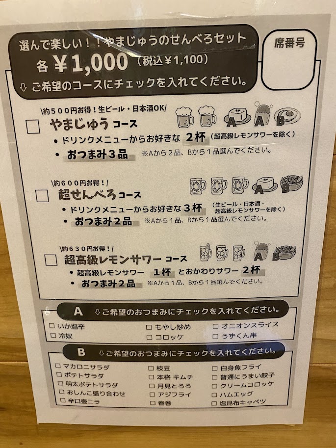 1軒目で生ビールが飲みたいので、やまじゅうコース(ドリンク2杯、おつまみ3杯)を選択。