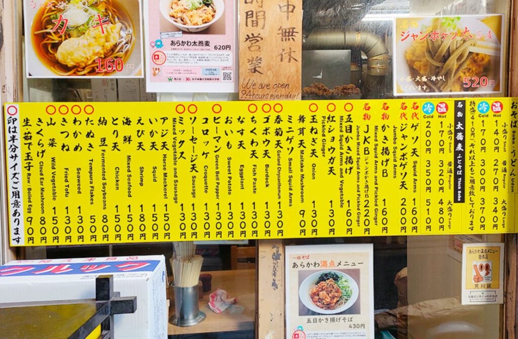 麵は通常そばと田舎そばを選べ、天ぷらの種類がとても多く、皆好きにアレンジして呪文のように唱え注文している。さながら蕎麦屋界の「宇ち多゛」のようだ。