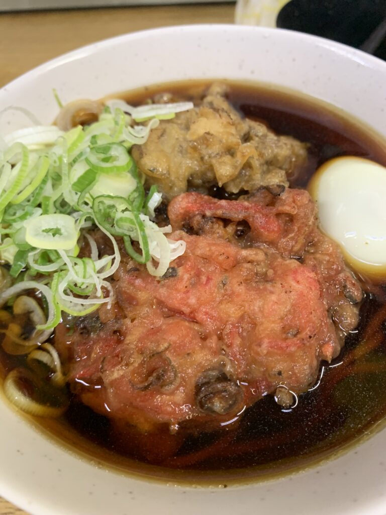 紅ショウガ天半分70円、舞茸天90円、ゆで玉子90円