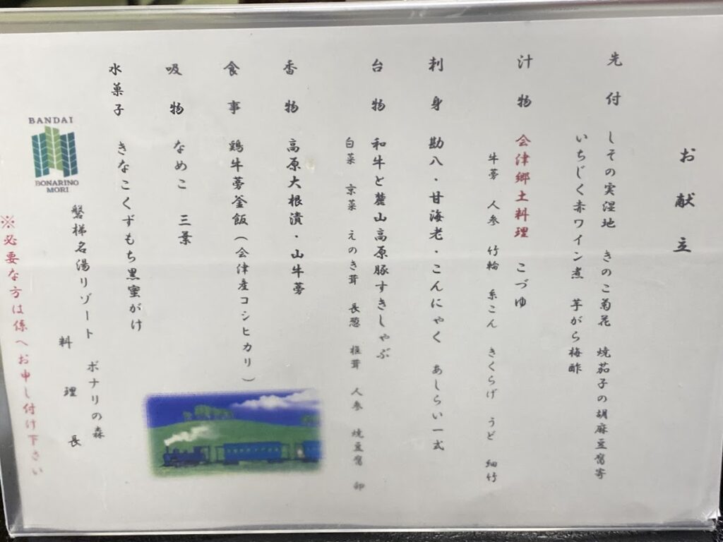 さて、夕食は宴会場で、会津の味覚を堪能する「会津BUKE和膳」。郷土料理の「こづゆ」、伊達鶏の釜飯など会津武家料理をイメージしているとのこと。メインの黒毛和牛と麓山高原豚のすき焼きは、地酒の稲川と合わせて大変美味しゅうございました。