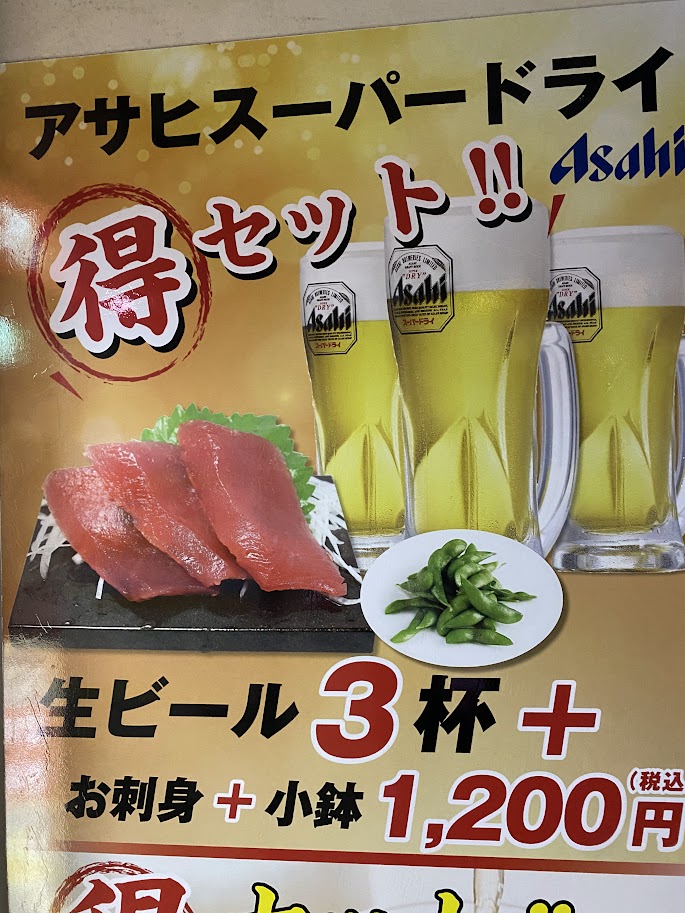 生ビール3杯+お刺身+小鉢が1,200円。角ハイボール3杯券600円、クリアアサヒ生200円など、どう考えても値段設定がおかしい。