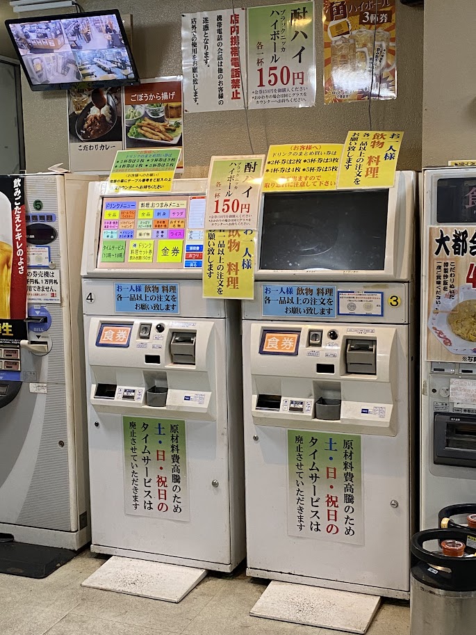 自販機は「お一人様 飲み物、料理 各1品以上の注文をお願いします」とある。