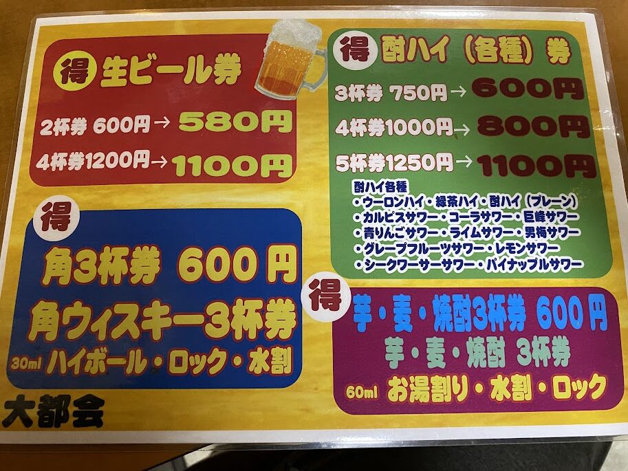 芋・麦・焼酎3杯券600円、酎ハイ5杯券1,100円などもある。