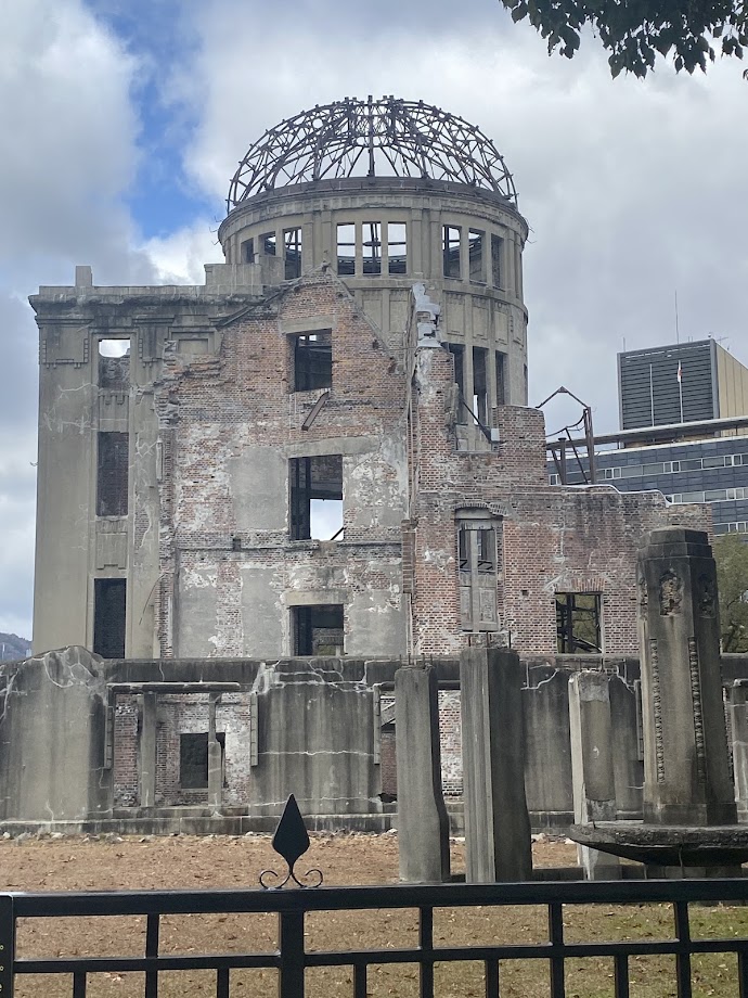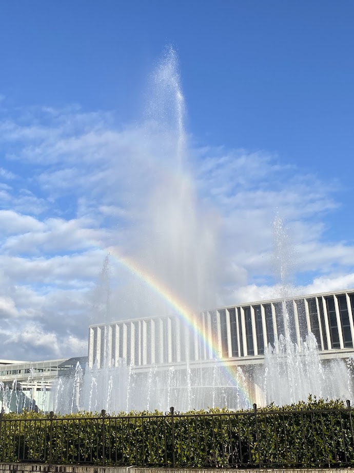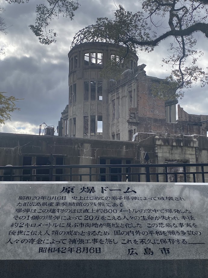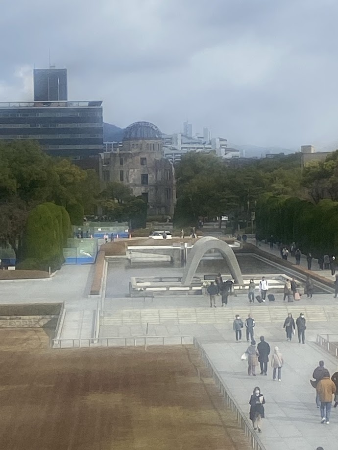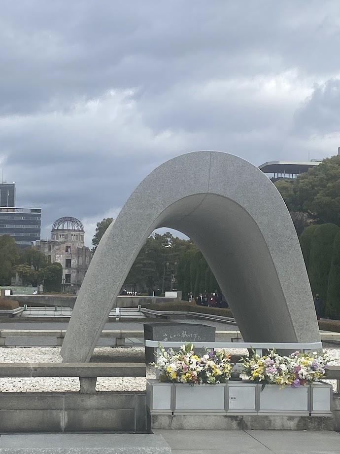 この日は雨上がりの快晴で、広島平和記念資料館前の噴水から大きな虹が見え、とても綺麗だった。ベンチに10分程たたずみ、瞑想して被爆者への想いを馳せていた。