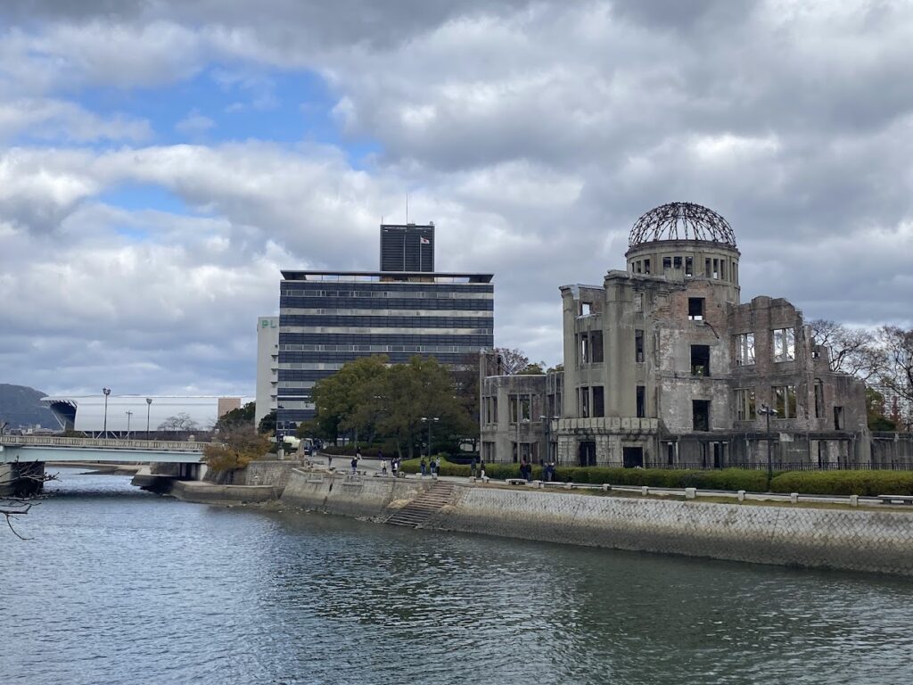 公園の川沿いから見た原爆ドームは、修学旅行生の写真スポットで、川の奥にはサンフレッチェ広島のホーム、エディオンピースウイング広島が見える。ちなみに広島カープの旧広島球場の跡地は原爆ドームのすぐ裏である。