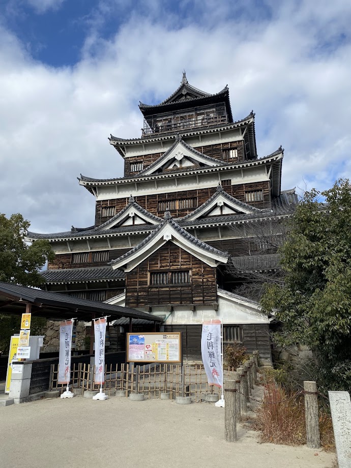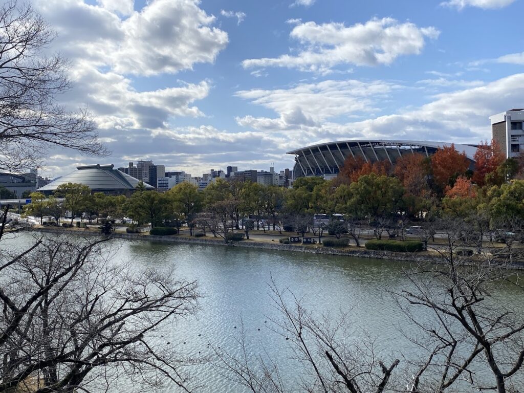 広島城は天守が老朽化のため2026年3月に閉城することになったが、体力温存のため、天守閣には訪れず前のベンチで休んだ。原爆ドームの方向には、外堀の向こうに「広島グリーンアリーナ」サンフレッチェ広島の「エディオンピースウイング広島」が見える。