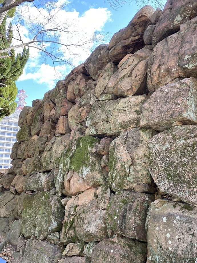 城壁に囲まれ、外堀の幅も大きい。爆風で残ったユーカリの木が威力の凄さを物語っていた。城壁は赤くなっており、原爆の痕がはっきり見て取れる。
