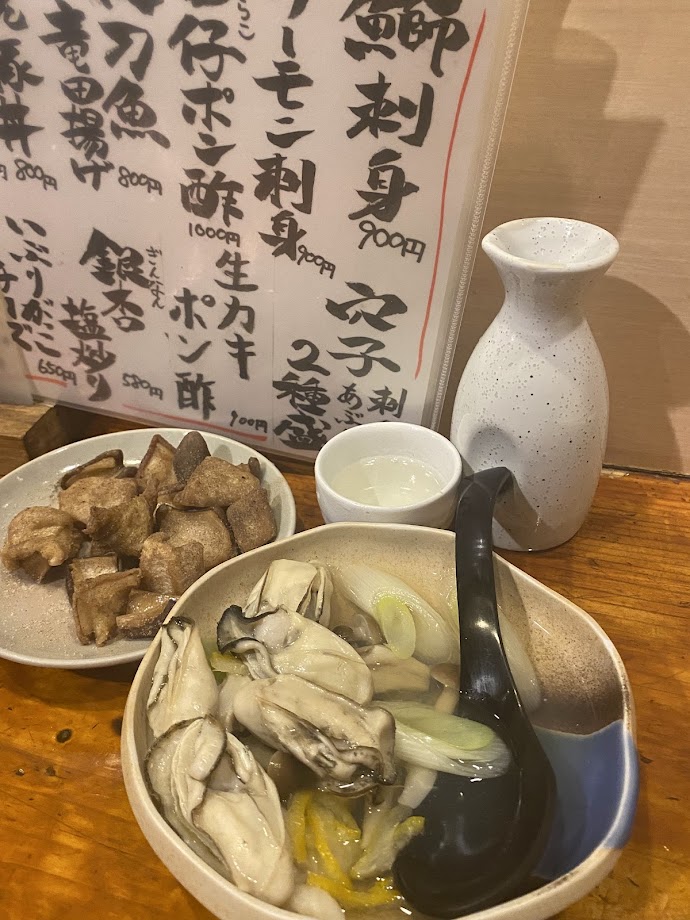 牡蠣の酒蒸し、せんじがら(ホルモンを揚げたもの)、地酒。これぞ酒場放浪記。