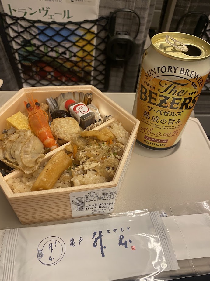 以前は駅弁を買っていたが、現地のものの方が美味しく物価高で値上がりしたこともあり、最近は紀伊国屋の弁当が多い。