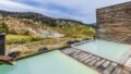 四角い浴槽が一つ。遠く山々が連なり展望台や徒歩ルートなどが見える。