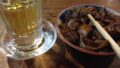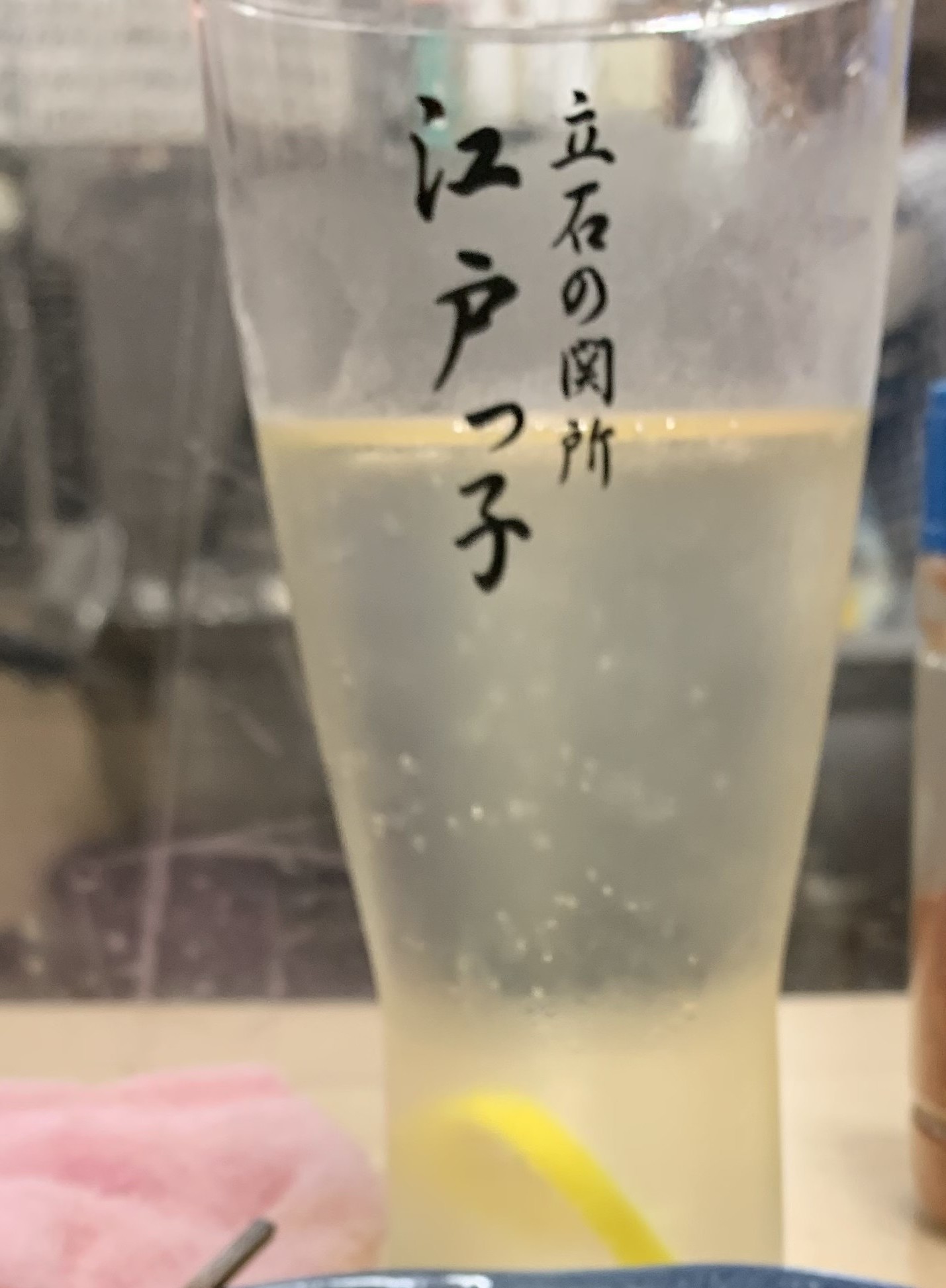 先代のおやじさんがお亡くなりになり、奥様が継いでいる。奥様は演歌歌手の天童よしみにそっくりであり、名物おかみである。膝が悪いため座っていることも多い。お店に必ず出ているのは、ある意味「江戸っ子のプライド」と常連への優しさであろうか。グラスの奥にその姿が見て取れる。
