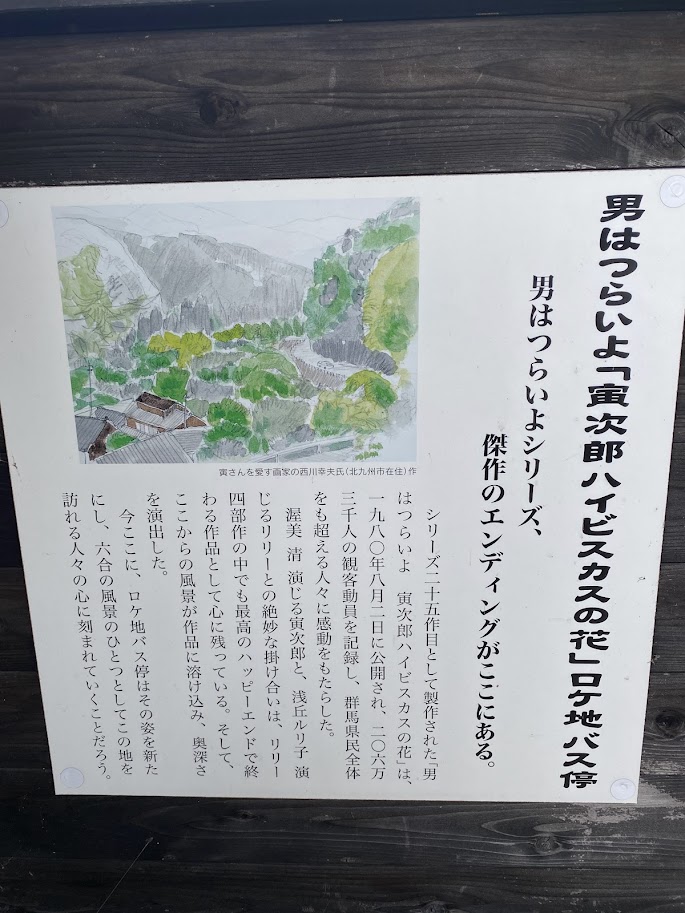 このロケ地は25作のハイビスカスの花のラストを飾る名場面。寅さんとリリーが山あいのバス停で再会する。その情景を浮かべただけでも涙が出てくる。