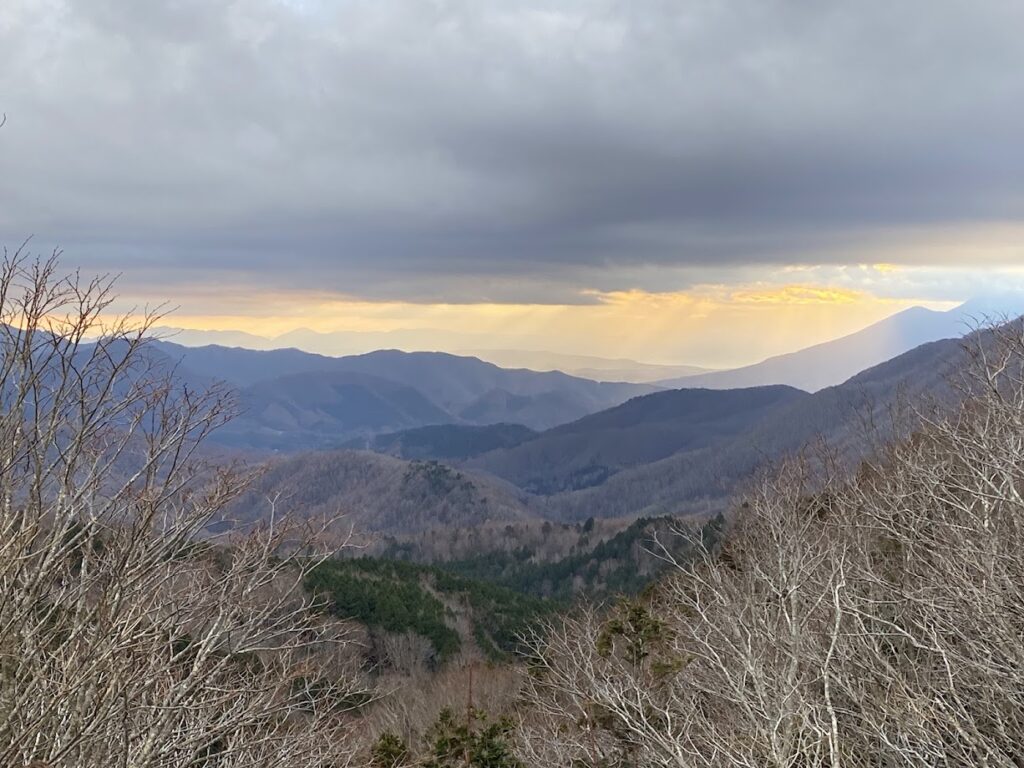 幕川温泉の看板をさらに進むと、磐梯吾妻スカイラインの始発点がある。日本の道100選にも選ばられ日本屈指のドライブルートであり、ここからの眺めは幾重にも山が重なり絶景である。曇ってきたが夕日が雲間から顔を出している。