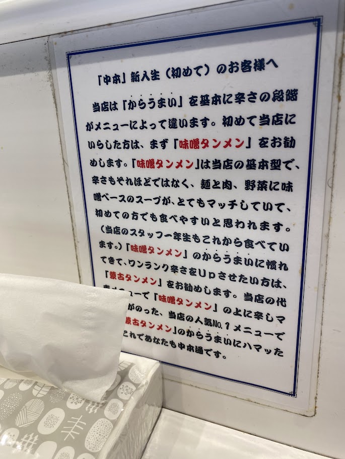 この日は「五目蒙古タンメン」1,040円、辛さ★×8を注文。昨今の物価高でかなり料金設定が高くなったが致し方ない。初めて(新入生)の方はこちらの説明(昔から変わらなくて懐かしい)にあるように、野菜たっぷりの味噌タンメン(ちょい辛)からがおすすめ。そこに麻婆をかけたのが蒙古タンメン。