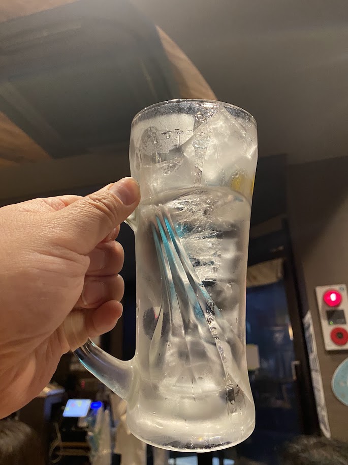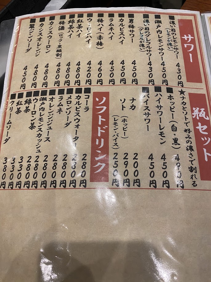まずは飲み物は何にしようか。昼間から缶ビールや焼酎を飲みこれが2軒目のため、生ではなく酎ハイ(昔ながらの酎ハイボール)いわゆる「ボール」を注文。