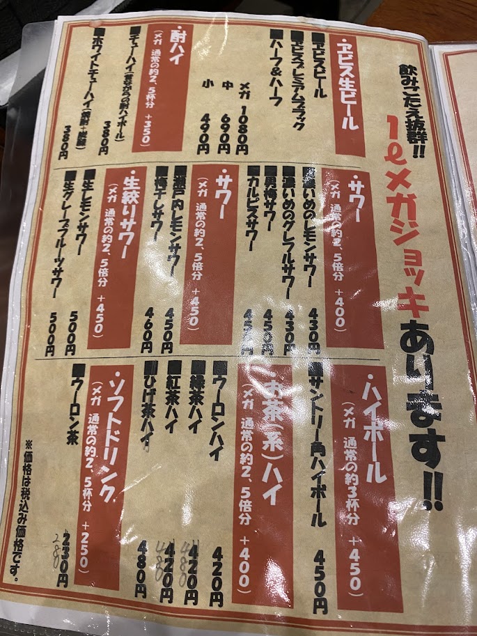 1人で1軒目だと間違いなくコスパの1ℓメガジョッキを頼むだろうな。