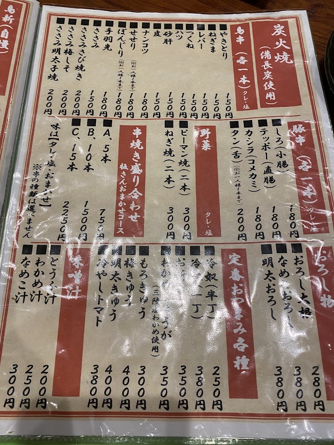 やきとり、ナンコツ、砂肝、手羽先・・・人気で限定のせせりとぼんじりは終了していた。