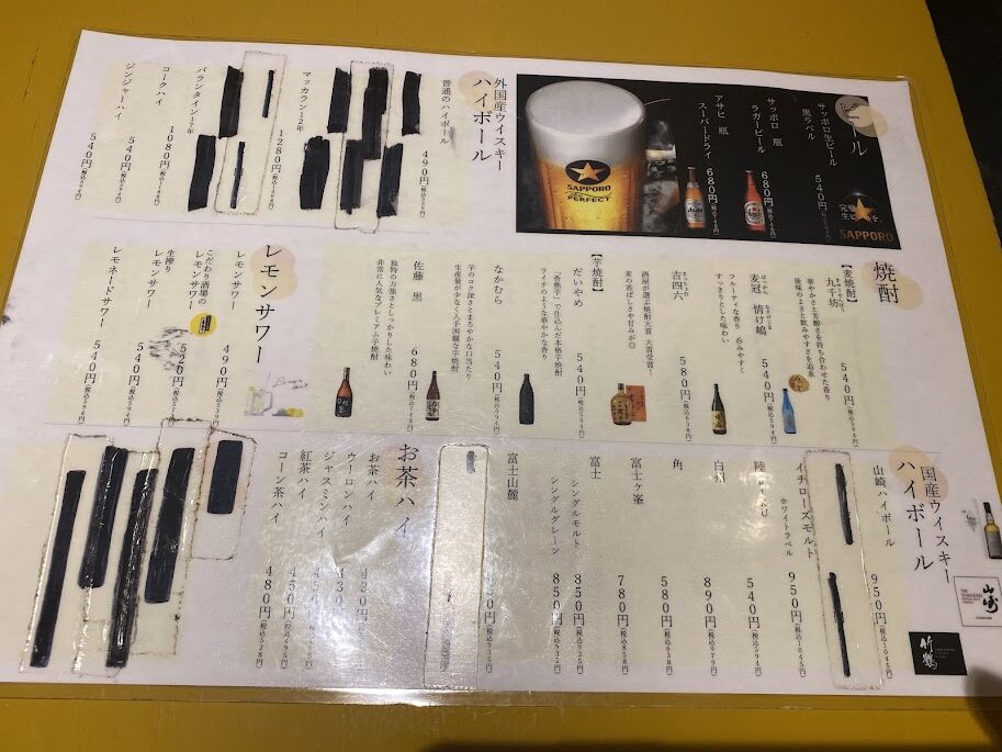 さて、飲み物は瓶ビールとハイボールで続けてみたが、サワー、日本酒、ワインなど何でもある。