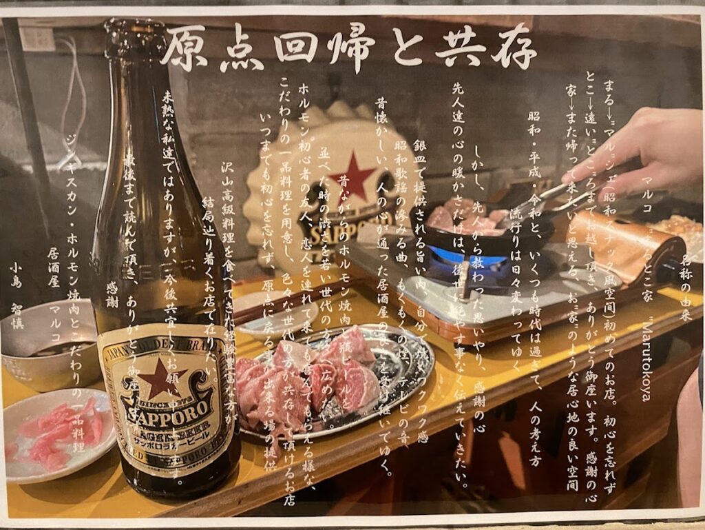 各メニューにあった「原点回帰と共存」見るからに興味がある言葉だが、トイレに行ったらそのうんちくが書かれていた。「沢山高級料理を食べてきた経験豊富な方が結局辿り着くお店でありたい」なるほど、素晴らしい肉の質と結びついた。